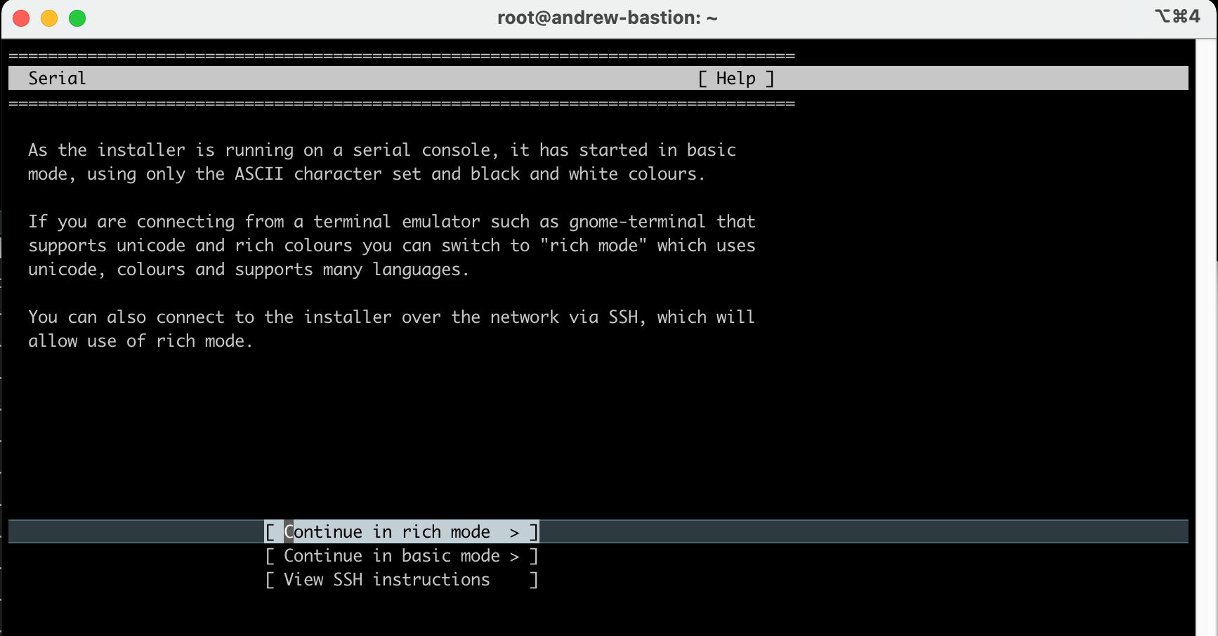 비록 Text Terminal 이지만, 조금이라도 예쁜 설치 화면을 원하면 "rich mode"를 선택한다.