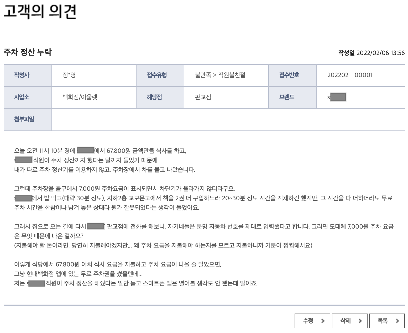 그렇다면, 현대백화점 주차 관리 시스템에 문제가 있나 싶어서, 아래처럼 현대백화점 고객의 의견 에 문의 글을 올렸다.