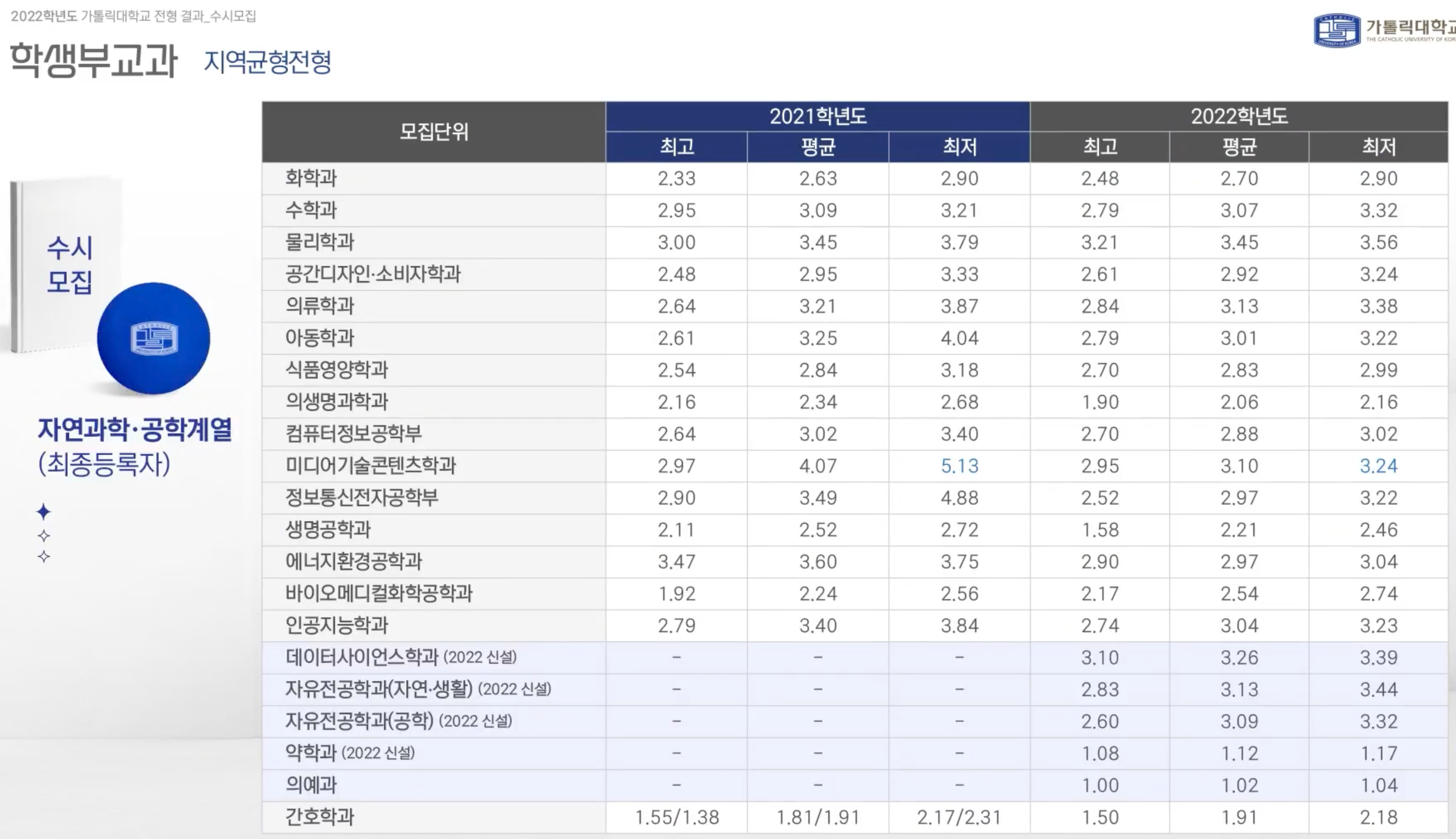 카톨릭대학교 입학처 자료 - 2022년 수시/정시 전형 결과