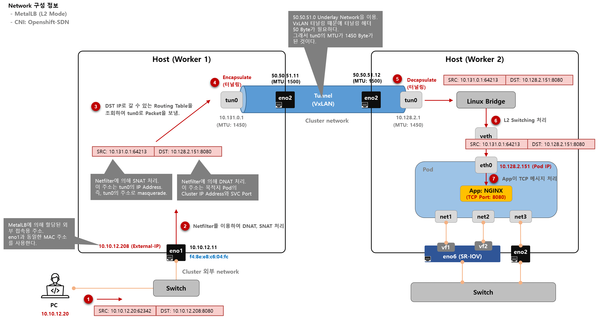 위 그림에서 Worker 1과 Worker 2의 tun0 간에는 ARP Packet이 브로드캐스팅되므로, 이미 Worker 1에서는 Destination Pod IP에 해당하는 MAC Address를 알고 있다.
