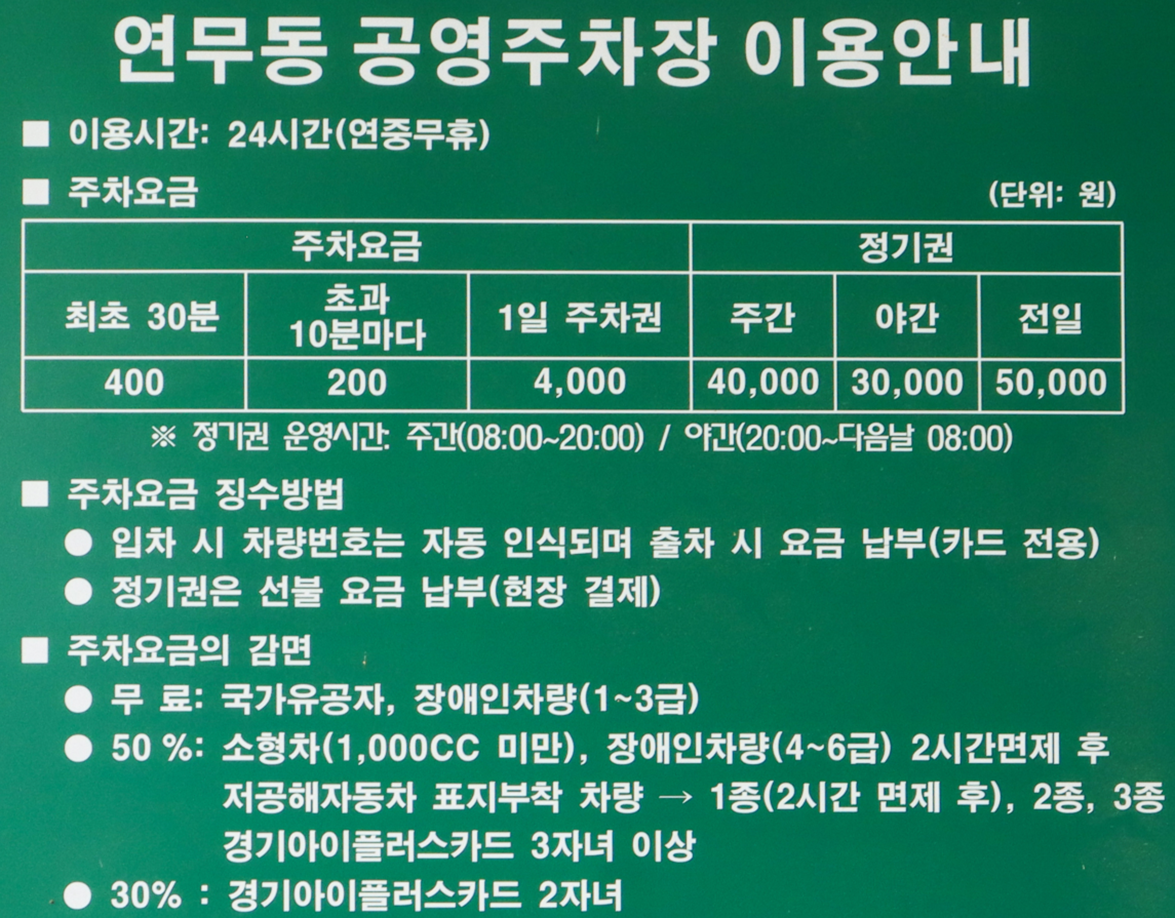 - 전기차 할인: 최초 2시간 면제 후, 추가 시간은 50% 할인.