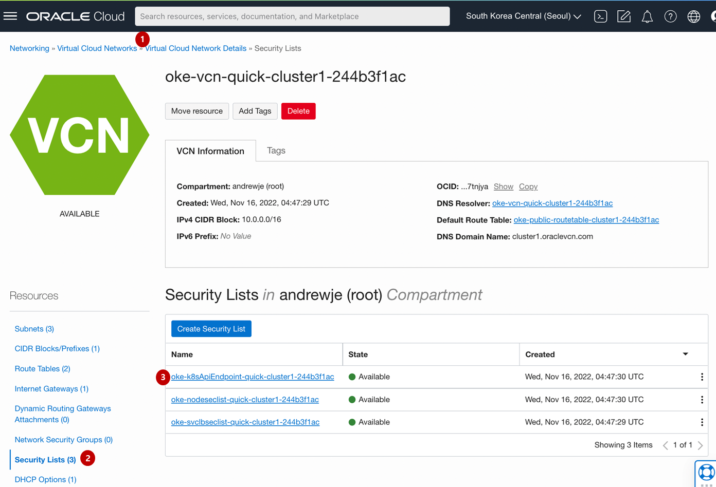 -> VCN을 클릭하면, 여러개의 Subnets이 목록이 보여지는데 oke-svclbsubnet-xxxx과 oke-nodesubnet-yyyy을 선택하여 Security Lists를 확인한다.