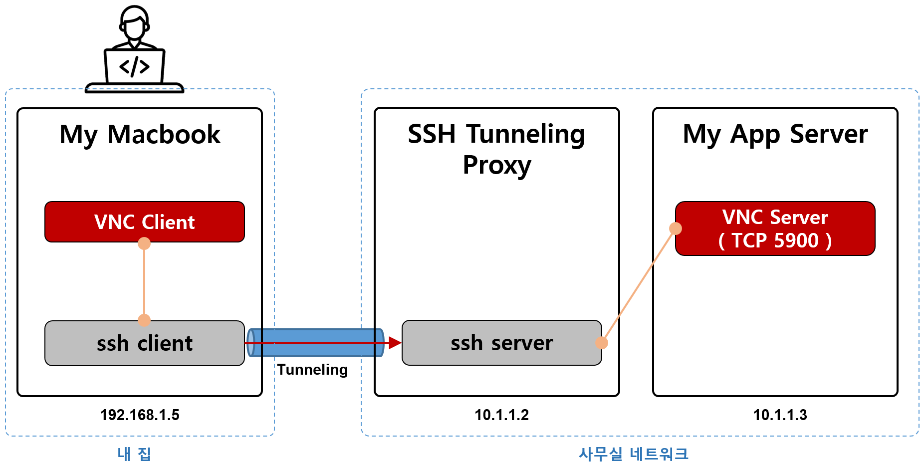 아래 그림과 같이 집에 있는 내 맥북 PC에서 회사에 있는 VNC 서버에 접근해보겠다.