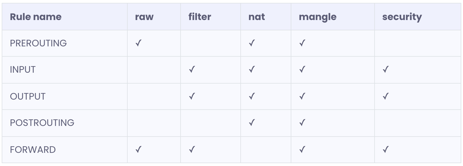 iptables는 다수의 Chain(예: PREROUTING, INPUT, OUTPUT, POSTROUTING, FORWARD)과 그 Chain에 정의된 Rule, 그리고 각 Chain에는 다수의 Table(raw, mangle, nat, filter, security)이 포함되어 있다.