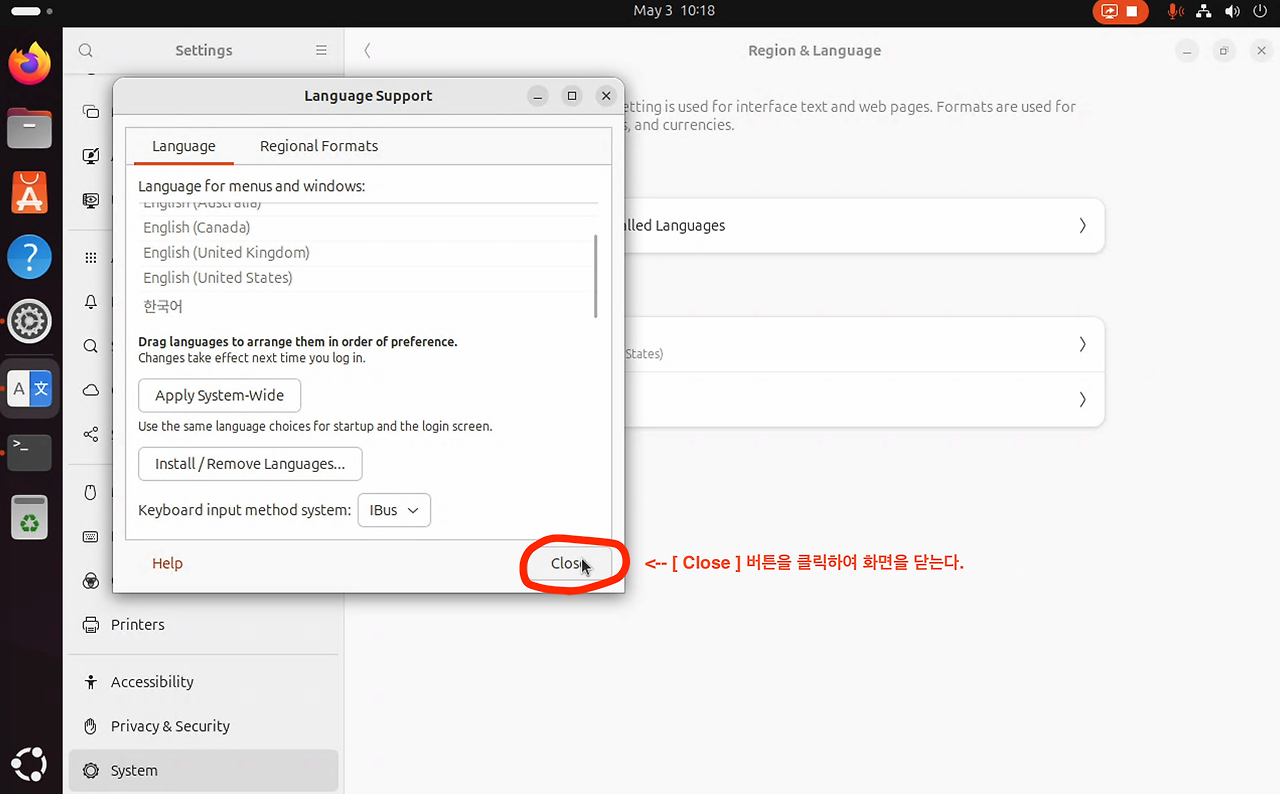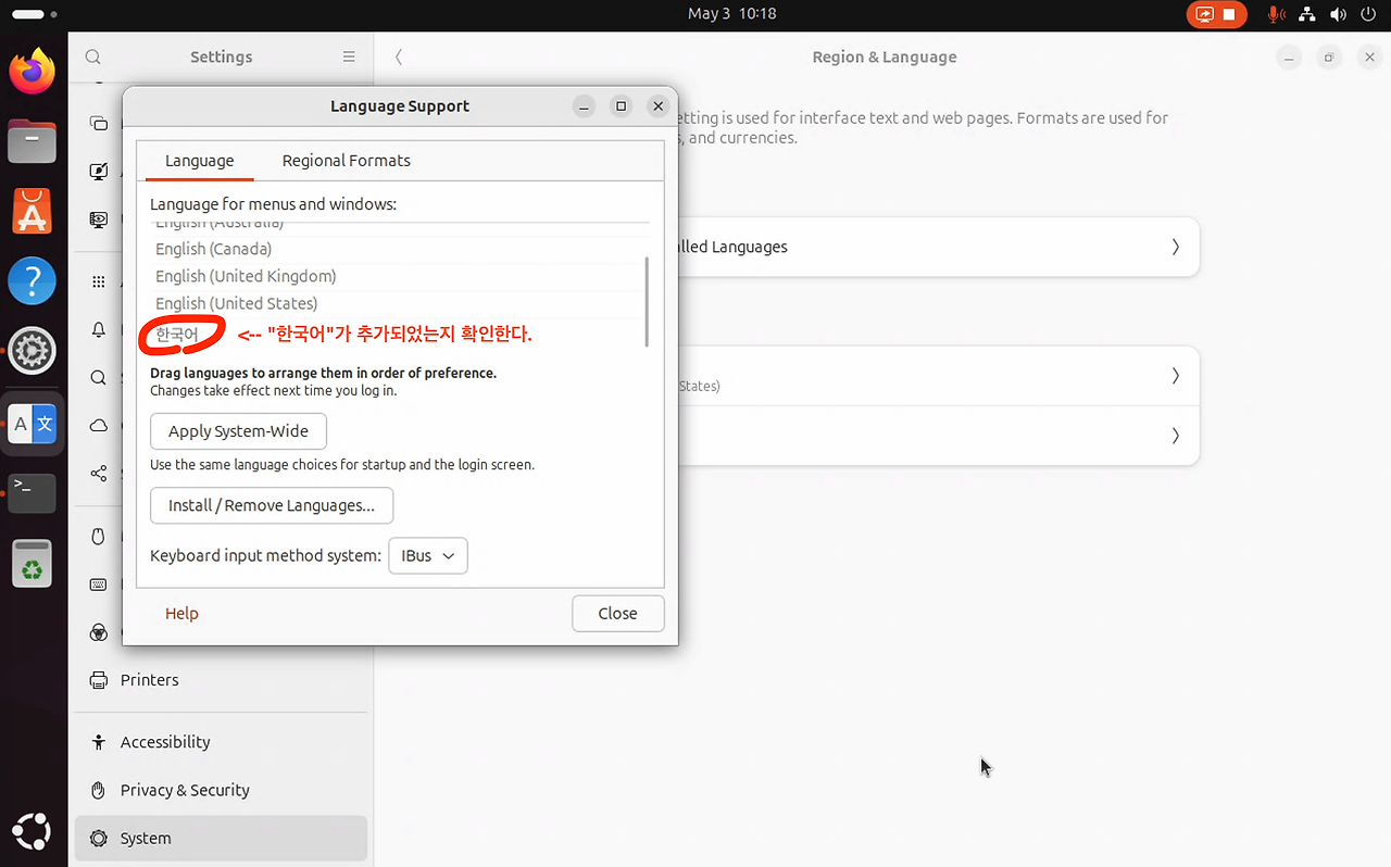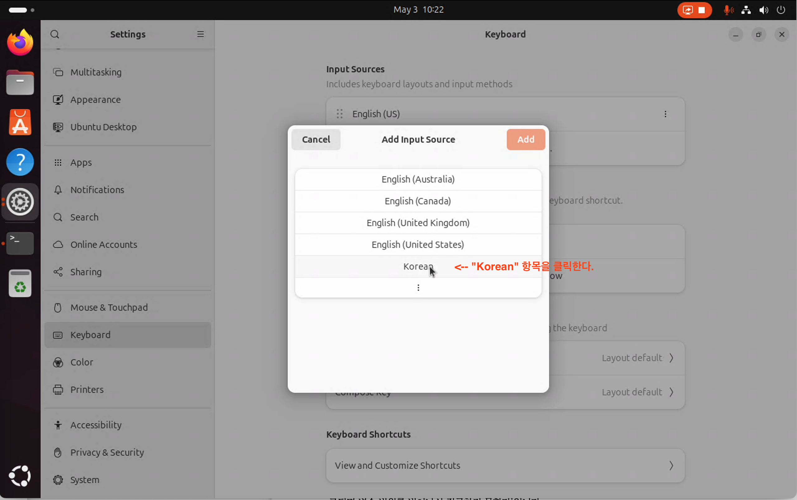 [ Input Method ]로써 "Korean"을 선택한다.