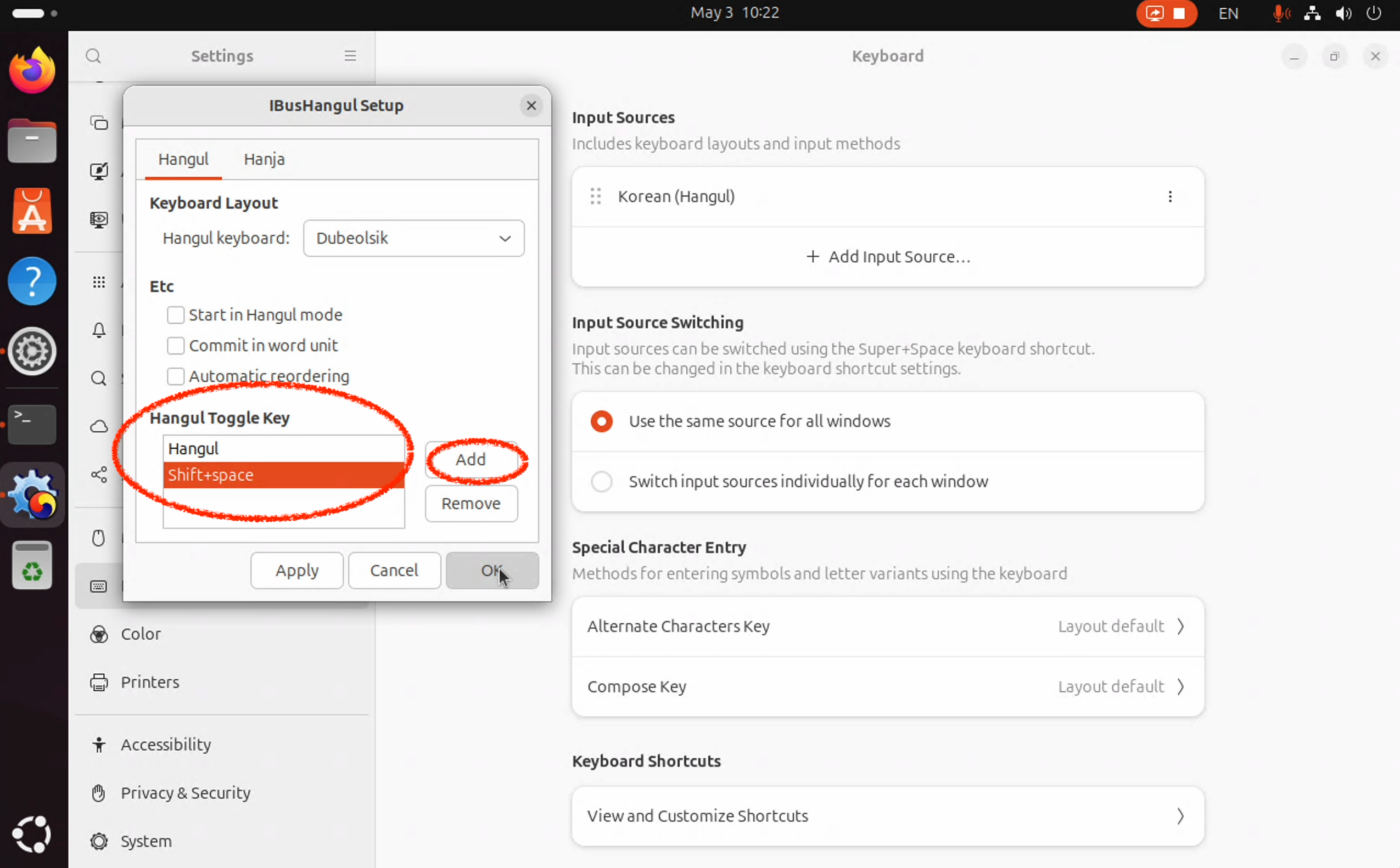꼭 "Hangul"을 선택해야 한다. Korean을 선택하면, 한영 전환이 안 된다.