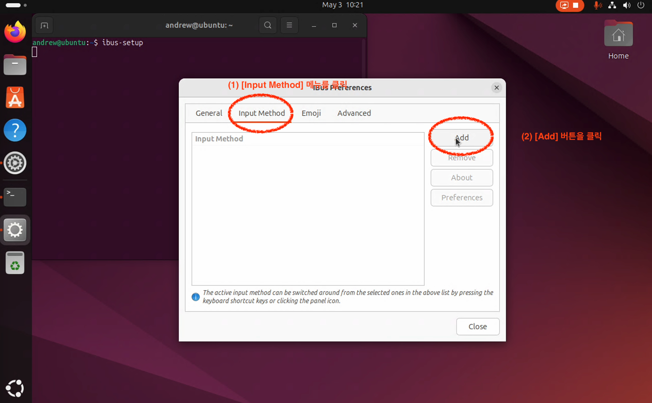 아래 화면과 같이 [ ibus-setup ] 명령을 실행하여, [ IBus Preferences ] 화면을 연다.