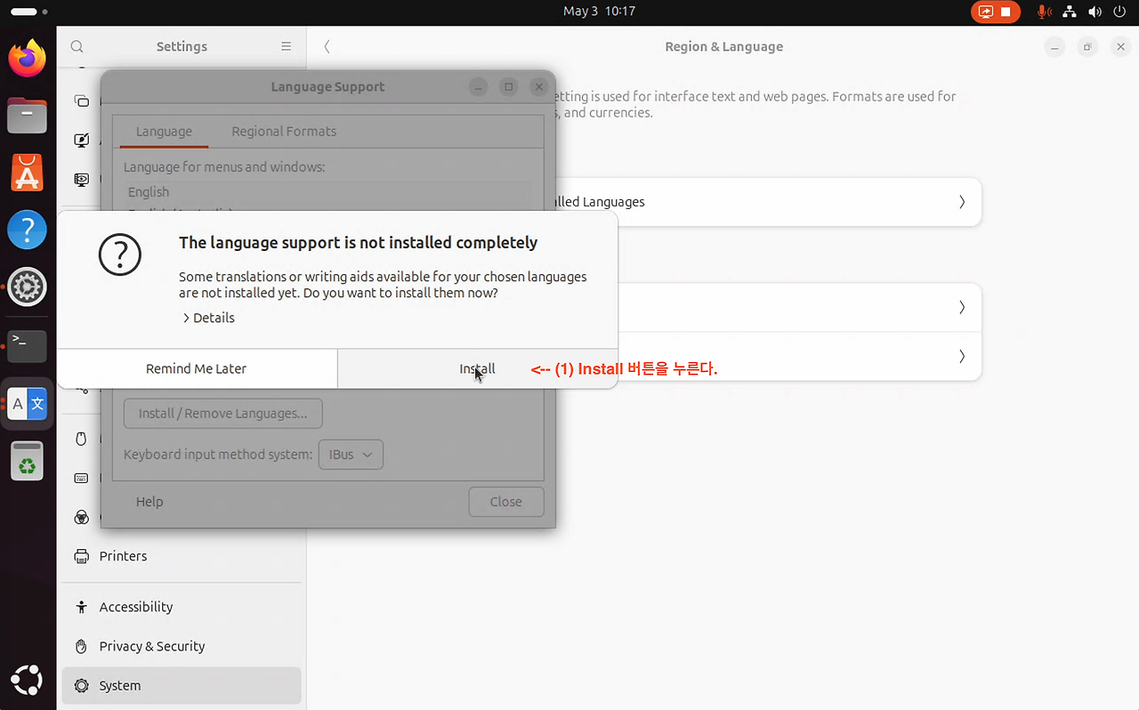 위와 같이 "한국어 언어 지원"을 설치하고 나서, 아래와 같이 Ubuntu 24.04를 Reboot해줘야 한다.