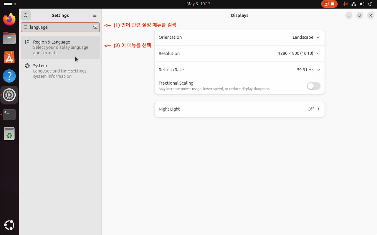 아래 Settings 화면을 이용하여 "Korean" 언어 지원 도구를 설치해야 한다.
