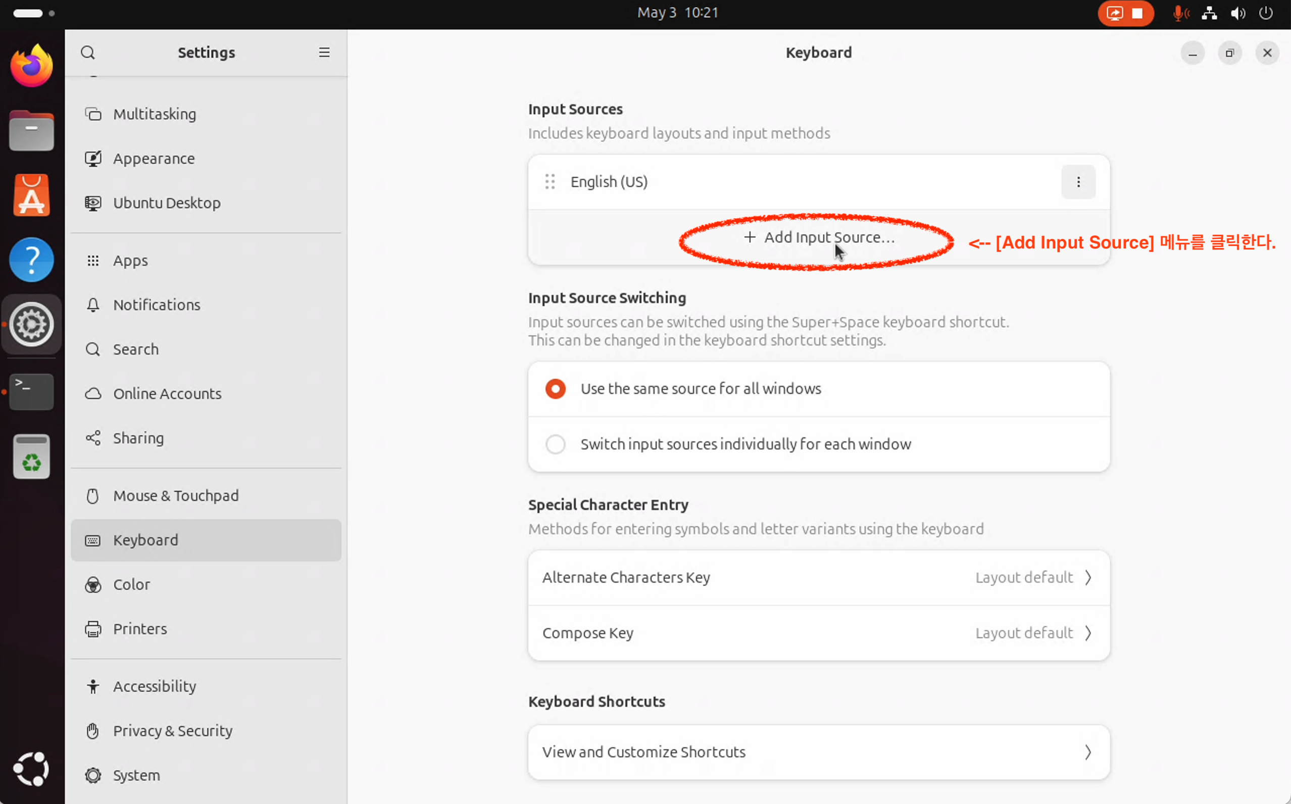 대부분 Ubuntu 22.04 ~ 24.04를 사용하는 유저들이 이 설정 단계에서 Korean을 선택하기 때문에 한영 변환이 잘 안 되는 것이다.