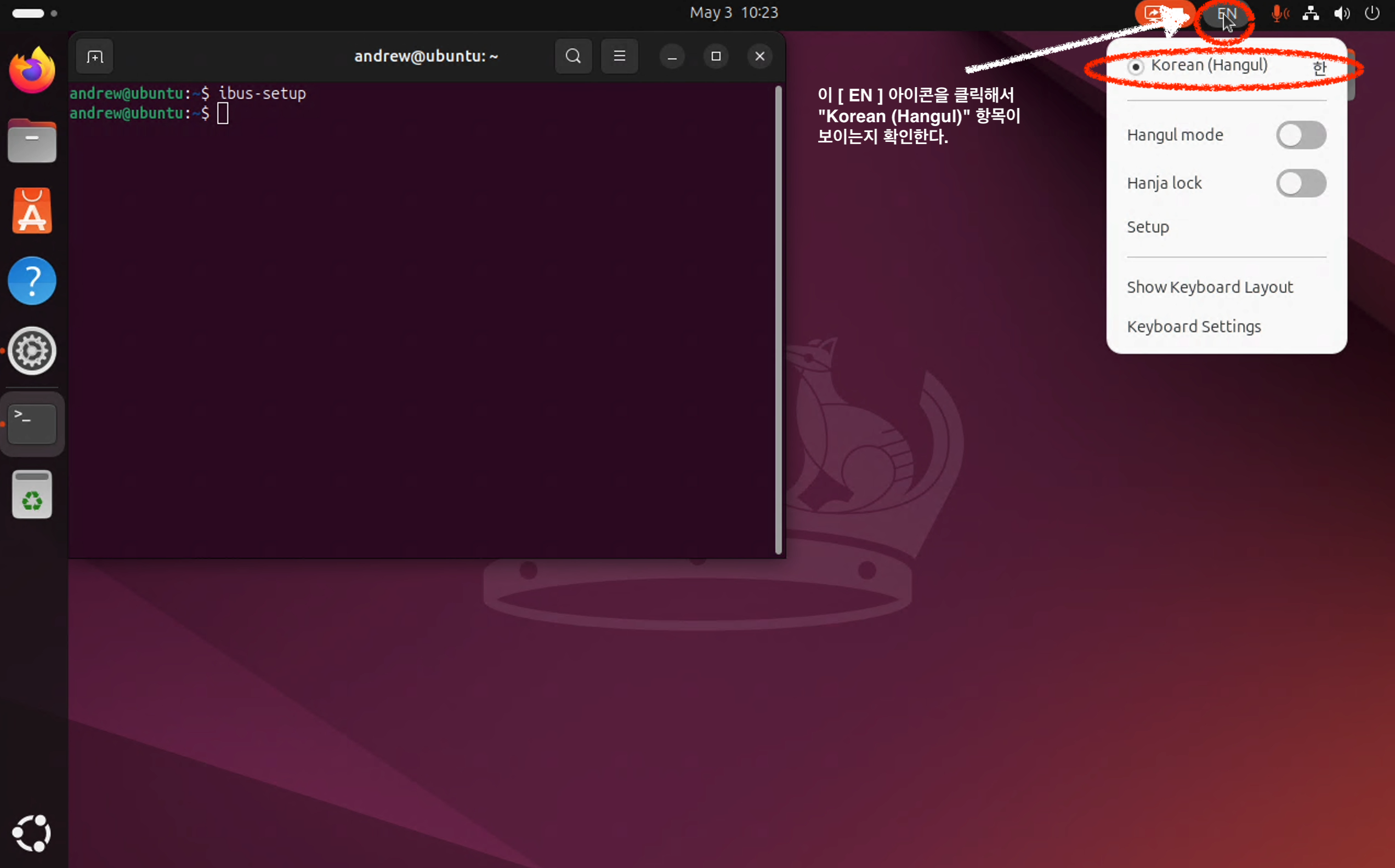 Ubuntu 24.04 데스크탑 화면의 우측 상단에 [ EN ] 아이콘을 클릭해서