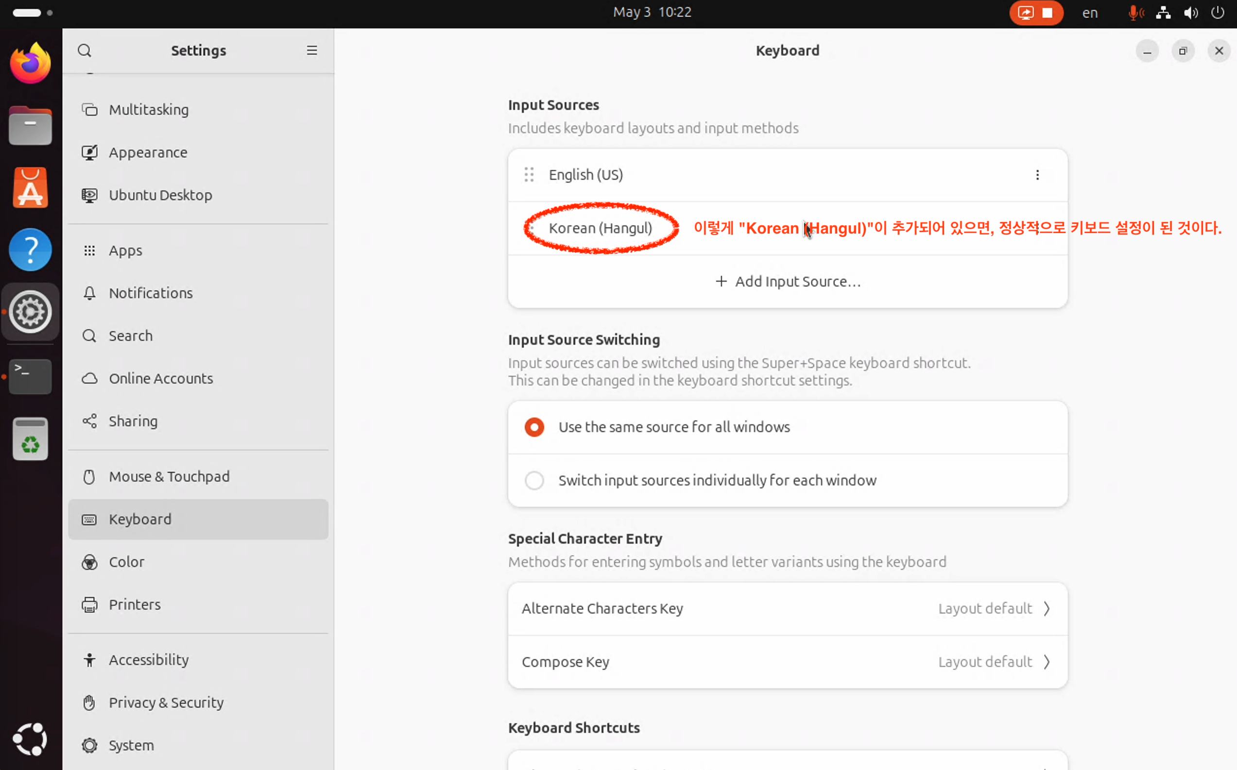 !!! 한글 입력을 위해 설정해야 할 핵심은 키보드가 "Korean -> Korean"이 아니라 "Korean -> Hangul" 이라는 것 !!!