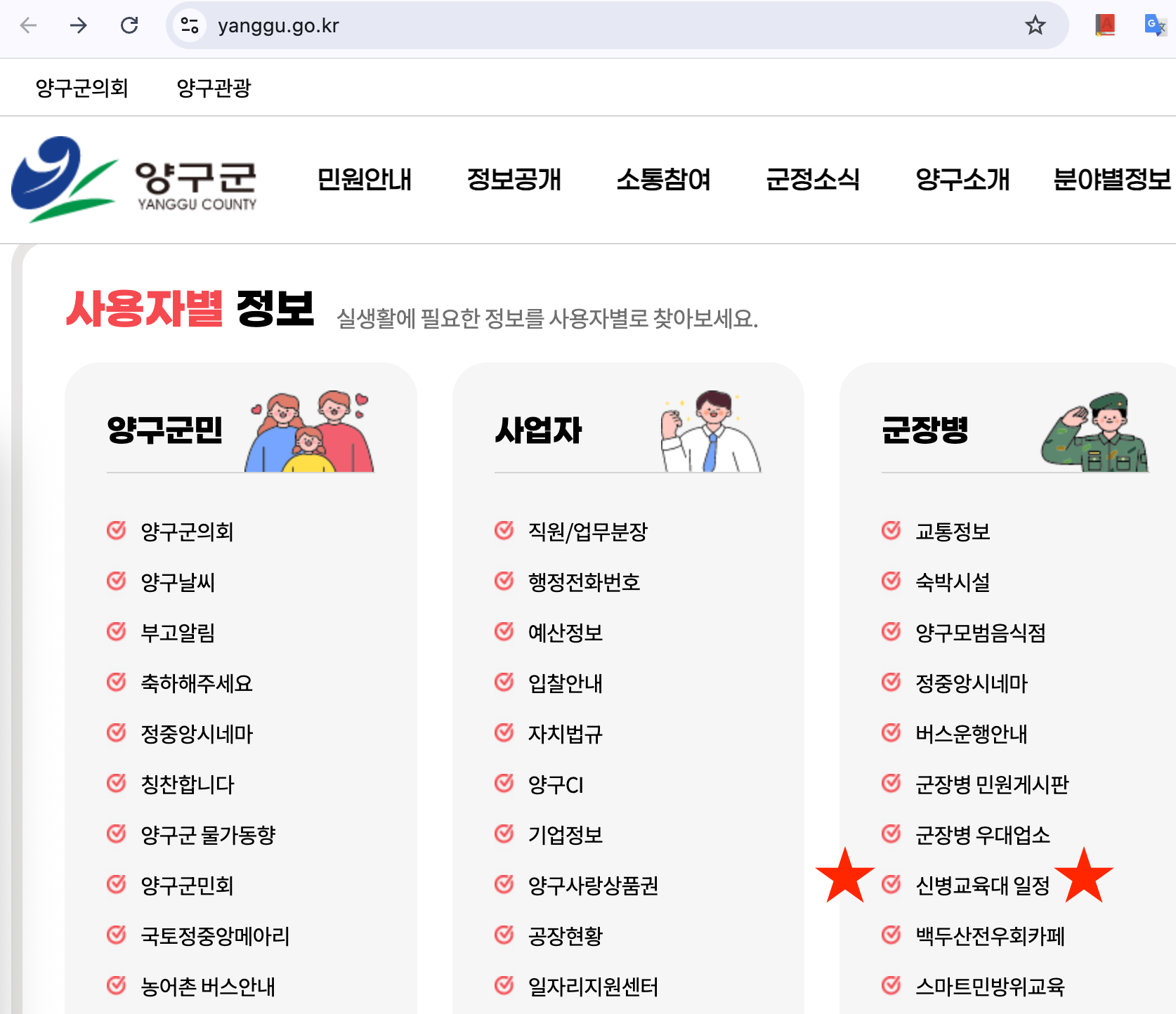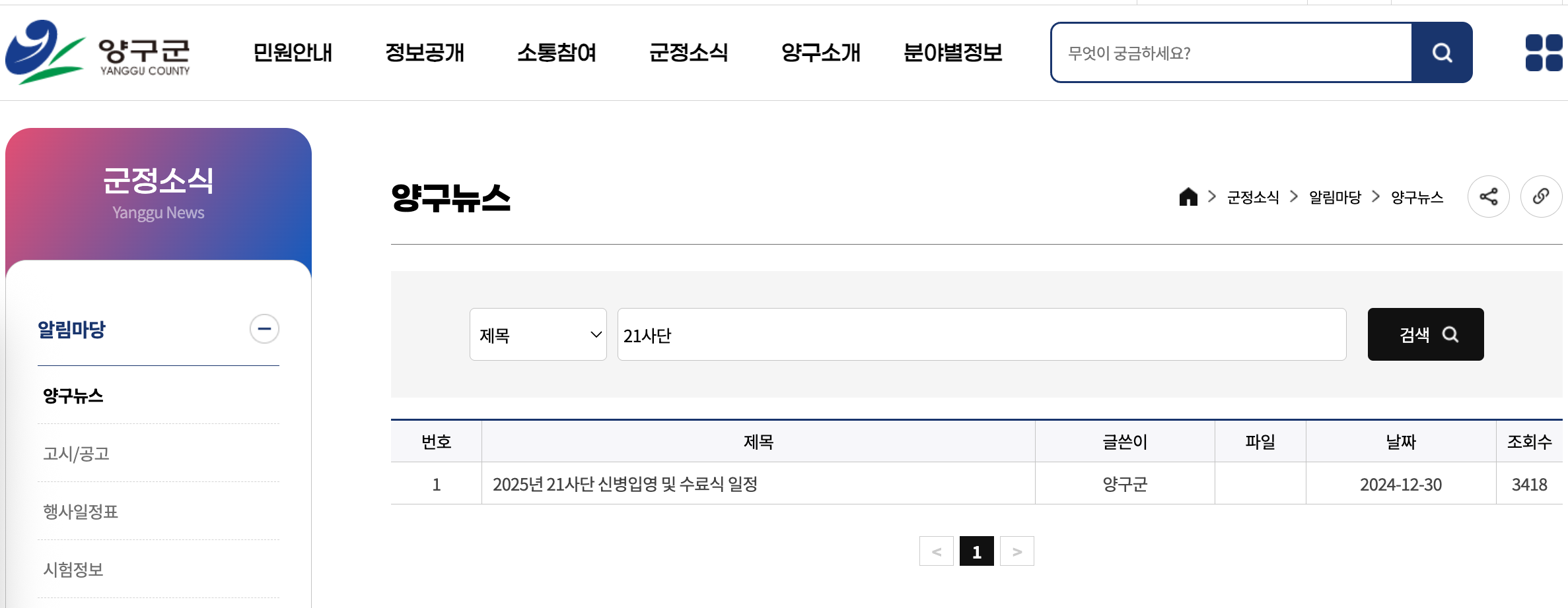 [양구군청 홈페이지] -> [사용자별 정보] -> [군장병] -> [신병교육대 일정] 이런 순서로 웹 사이트 메뉴를 찾아가면 21사단의 입대 일정과 수료식 일정을 볼 수 있다.
