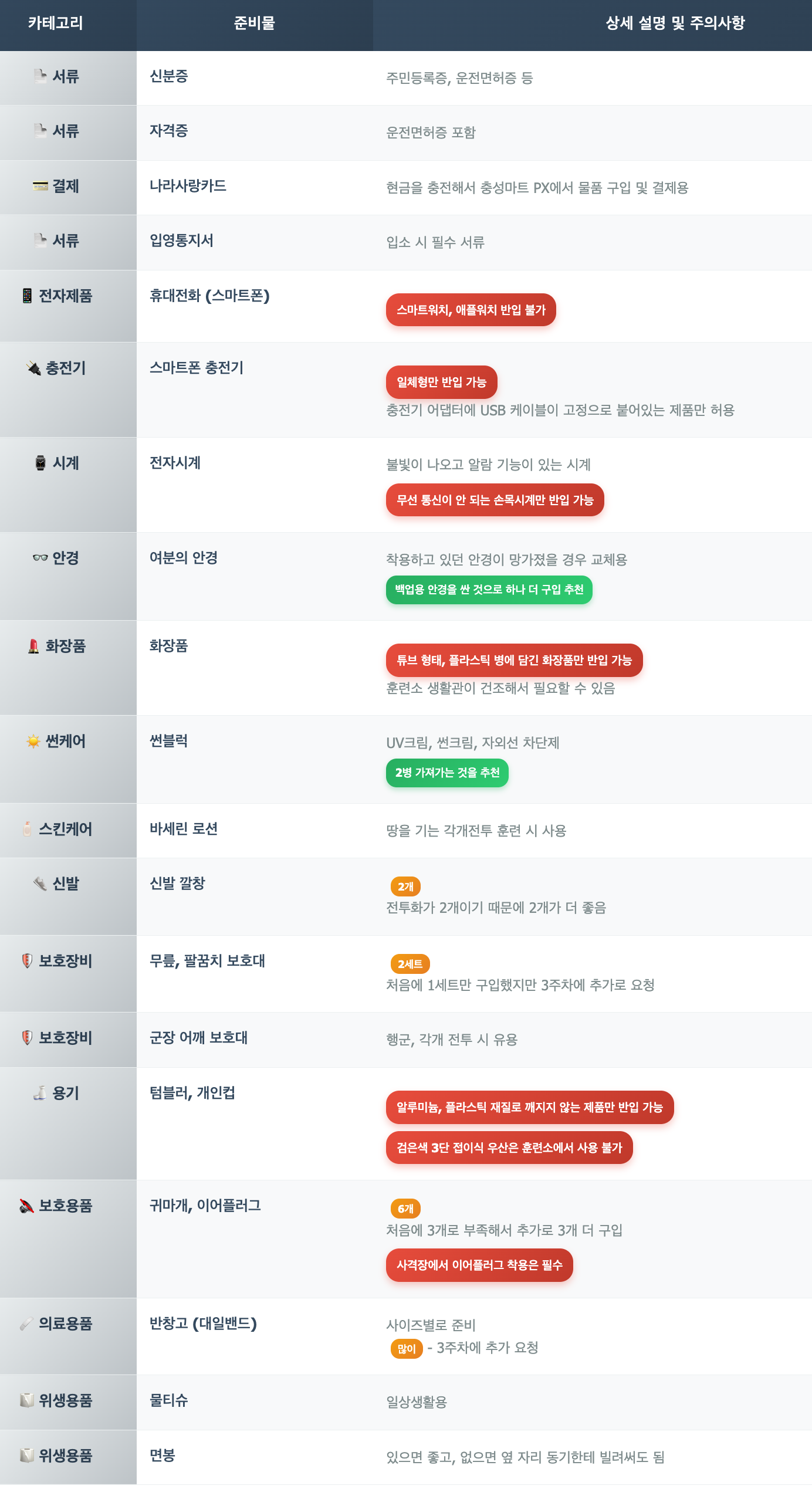 육군훈련소 유튜브 채널을 보니, 반입 가능한 물품이 정리되어 있다.