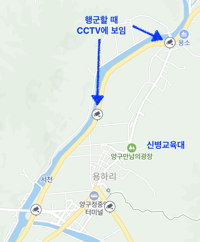 '양구 야촌교차로'를 검색해서 CCTV 아이콘을 클릭하면, 바로 아들이 행군하는 모습을 볼 수 있다.