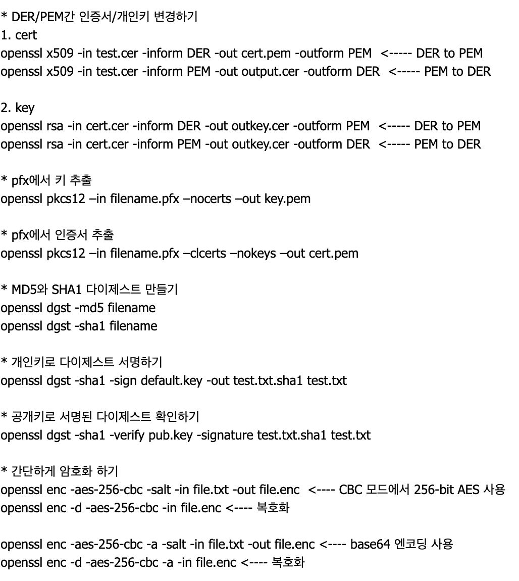 https://www.lesstif.com/software-architect/openssl-command-tip-7635159.html#OpenSSL%EC%9E%90%EC%A3%BC%EC%93%B0%EB%8A%94%EB%AA%85%EB%A0%B9%EC%96%B4(command)%EB%B0%8F%EC%82%AC%EC%9A%A9%EB%B2%95,tip%EC%A0%95%EB%A6%AC-%EC%9D%B8%EC%A6%9D%EC%84%9C%EC%A0%95%EB%B3%B4%EB%B3%B4%EA%B8%B0
