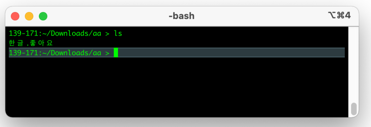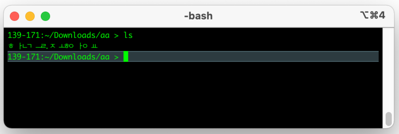 Mac OS의 iTerm2 터미널에서 한글 파일명을 작성하면, 아래 화면처럼 음소(자음, 모음)가 분리되면서 깨져 보이는 현상이 있다.