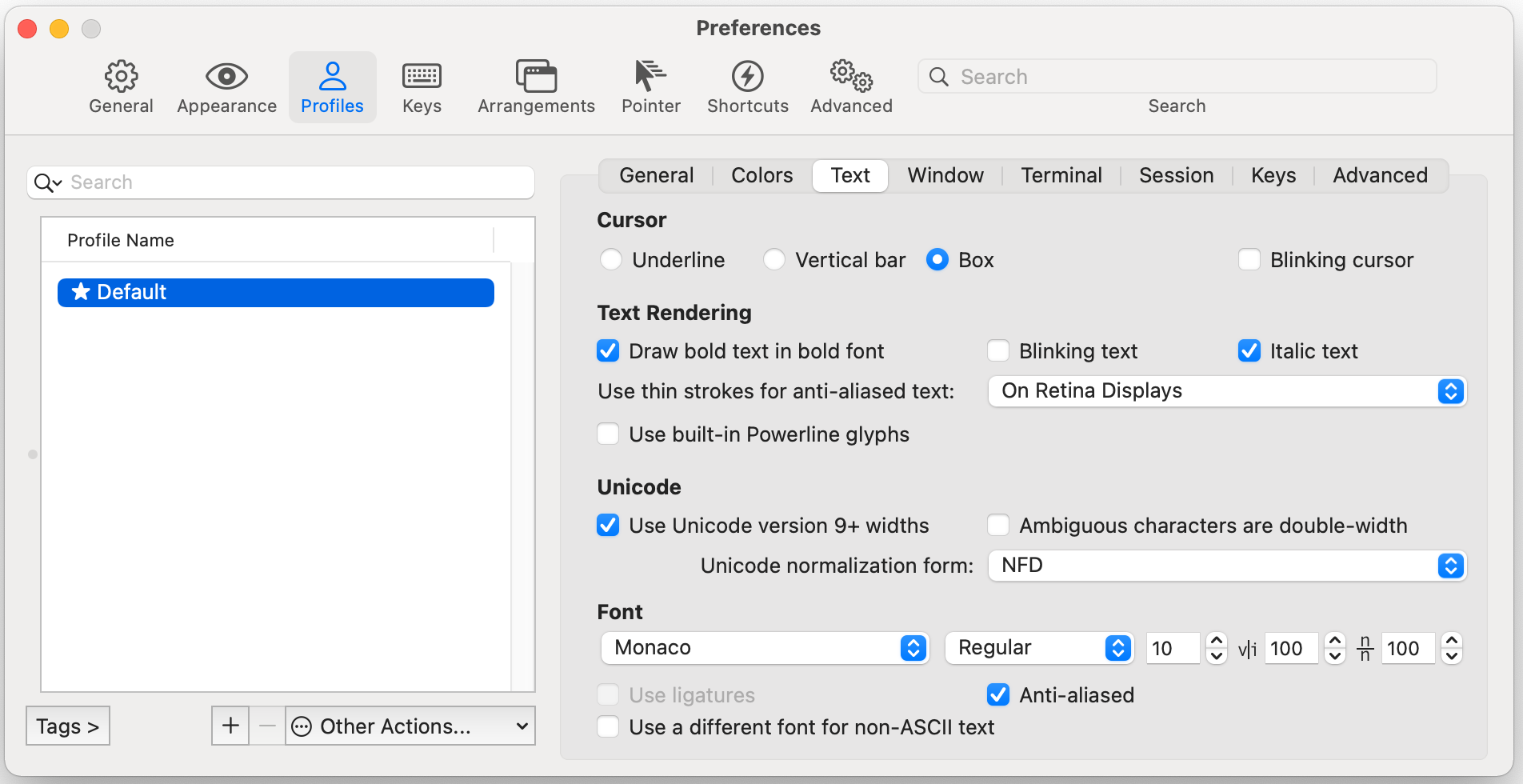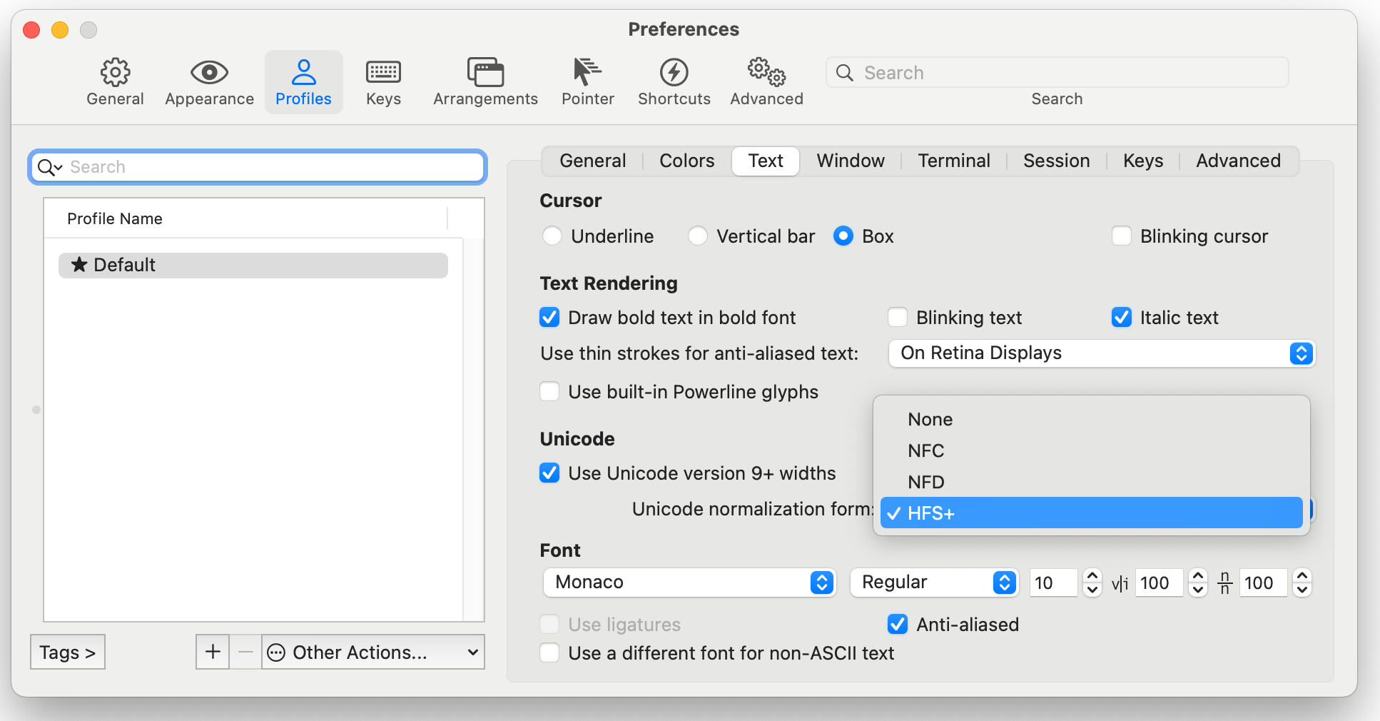 이 때, iTerm2의 설정 화면을 보면 아래 화면처럼 [Unicode normalization form] 항목이 NFD로 되어 있을 것이다.