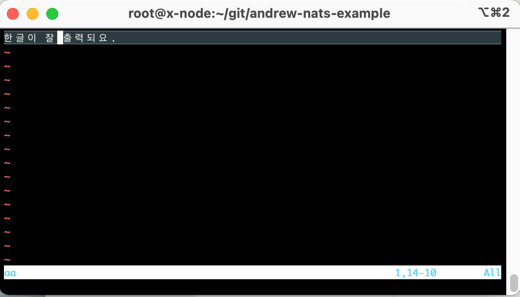 .vimrc 파일을 저장하고 닫은 다음에 다시 vi 편집기로 한글을 작성해보면, 아래처럼 한글이 깨지지 않고 잘 보인다.