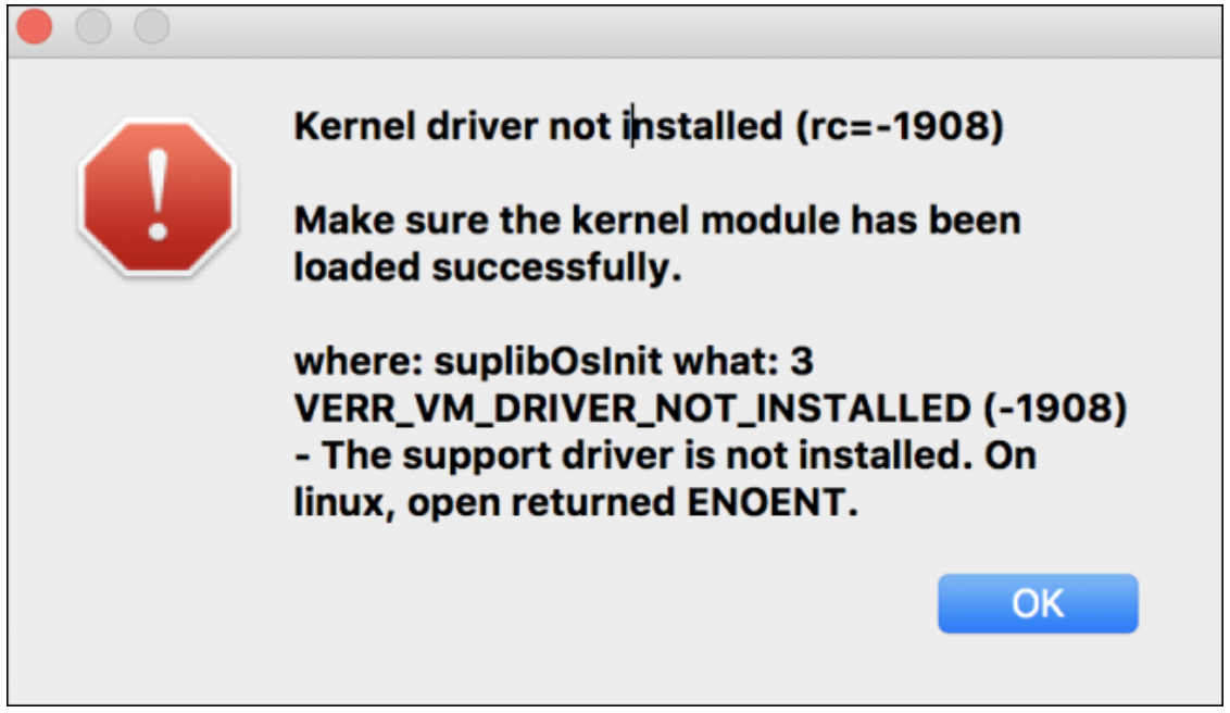 Macbook Pro에서 몇 년 동안 VirtualBox를 잘 사용했었는데, 갑자기 아래와 같은 rc=-1908 오류가 뜨면서 Virtual Machine (VM)이 기동하지 못 했다.