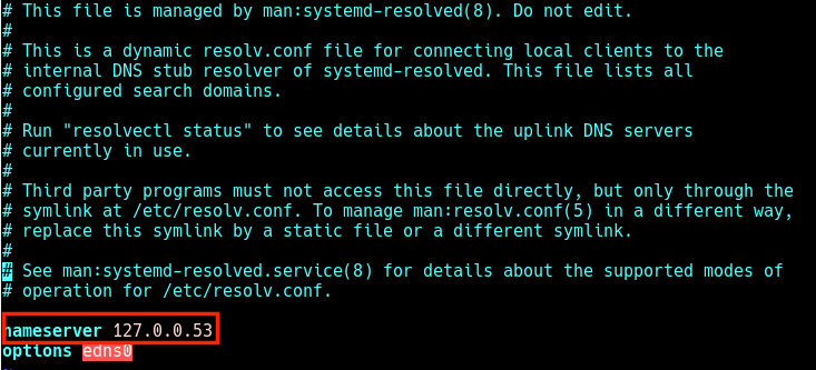 nameserver 기본 설정이 아래와 같이 127.0.0.53 으로 되어 있기 때문이다.