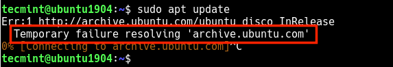 apt update 또는 apt install 명령을 수행하다보면, 아래 화면과 같이 Temporary failure resolving archive.ubuntu.com 이라는 에러가 발생하는 경우가 있다.