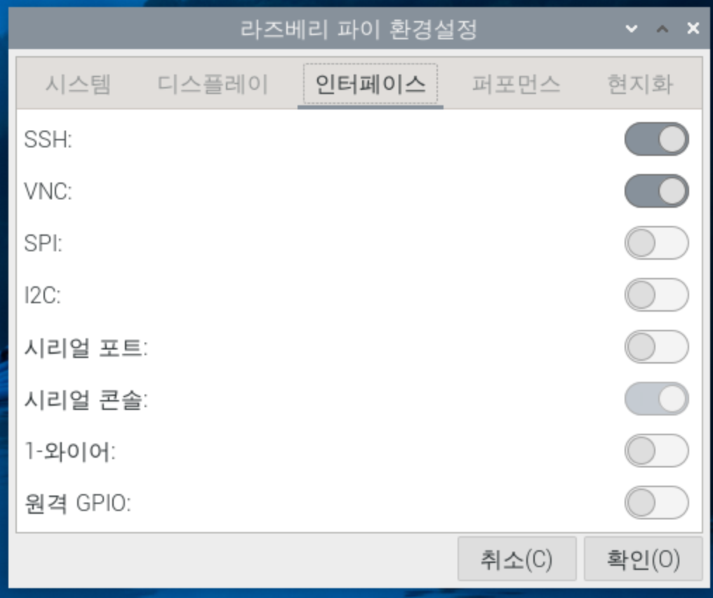 Raspbian Desktop 시작 메뉴에서 [ Raspberry Pi Configuration ] 창을 연다.