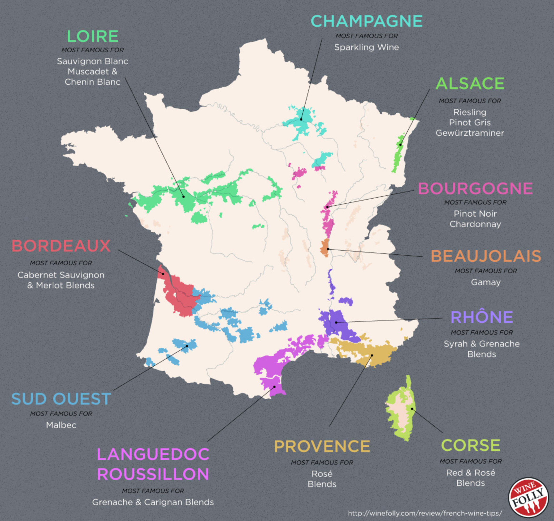 - France: Bourgogne 부르고뉴 , Champagne 샹파뉴 , Jura 쥐라 , Languedoc 랑그도크 , Provence 프로방스