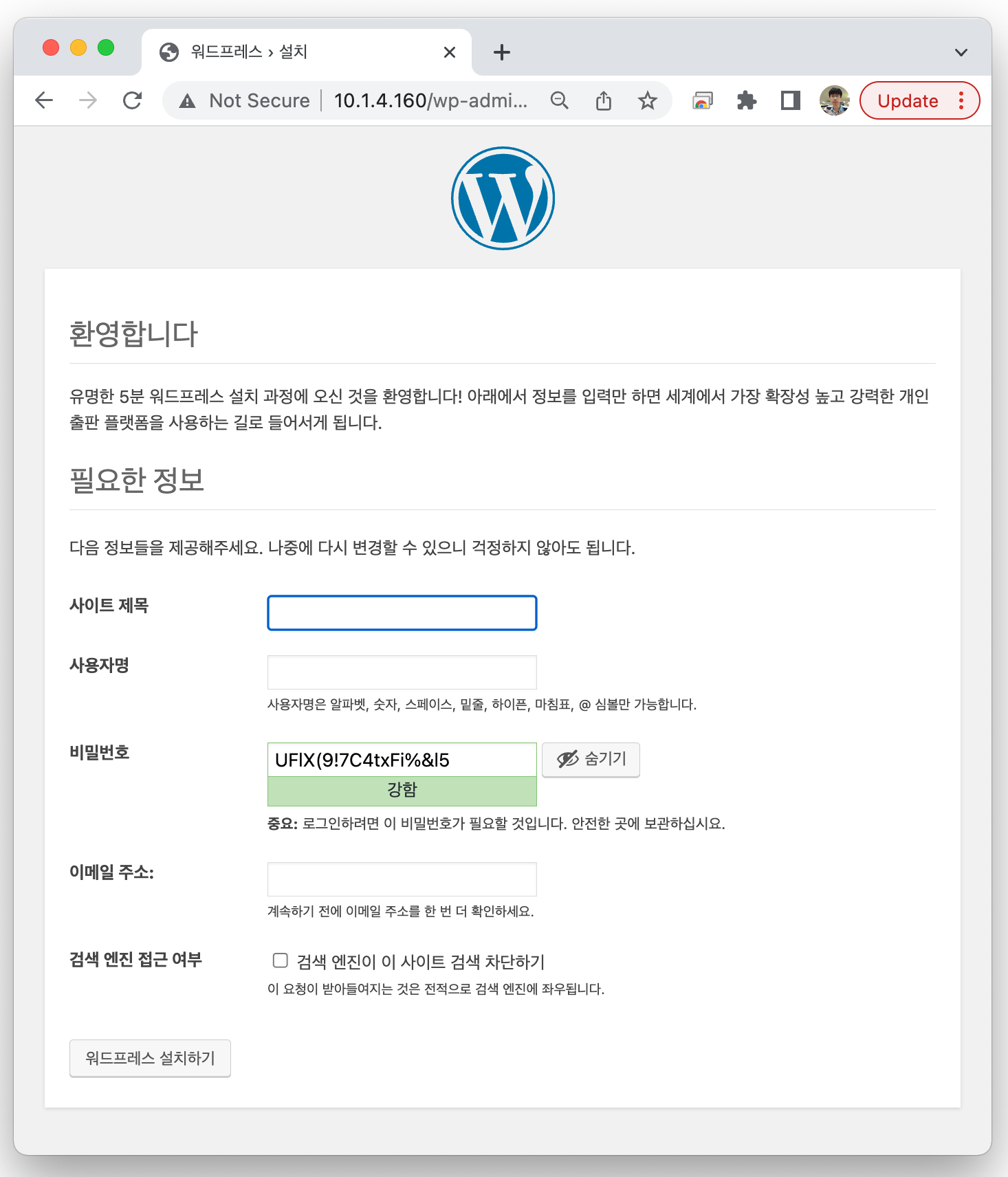 아래처럼 Wordpress 설정 화면이 출력되면, 정상 동작하는 것이다.