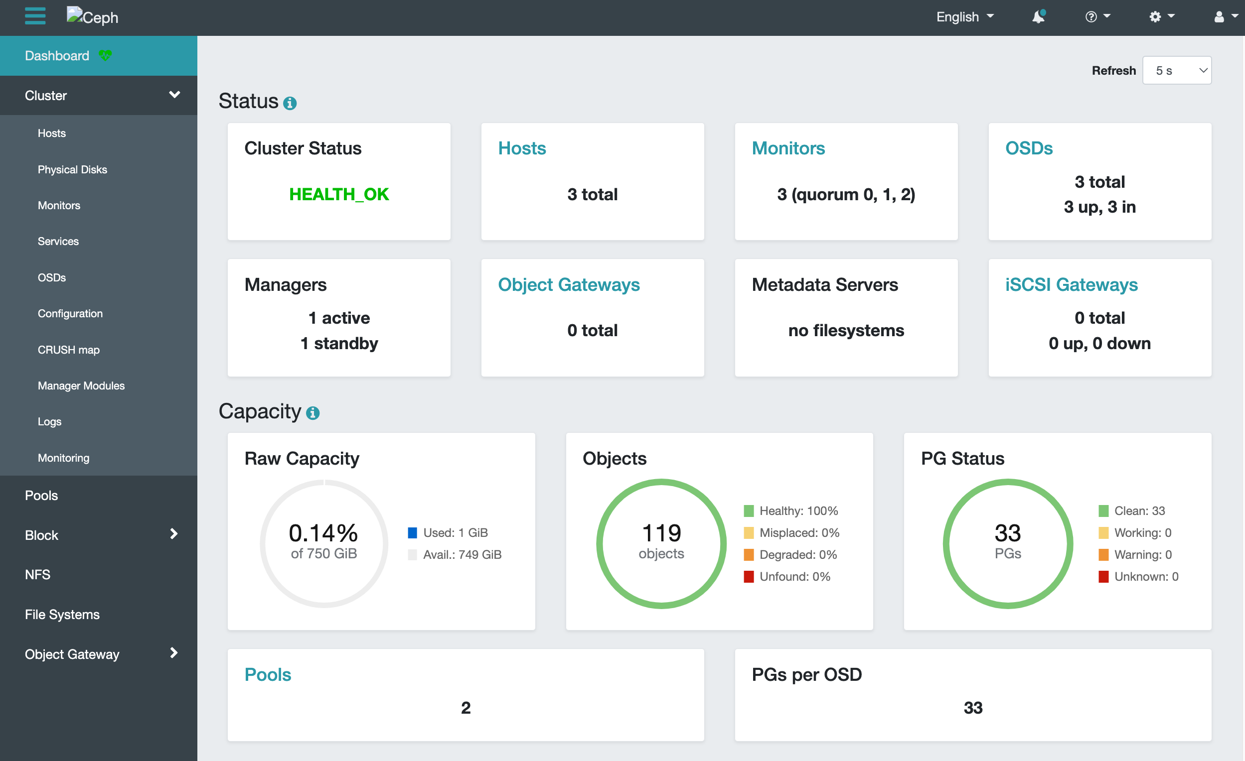 usage: 62 MiB used, 750 GiB / 750 GiB avail