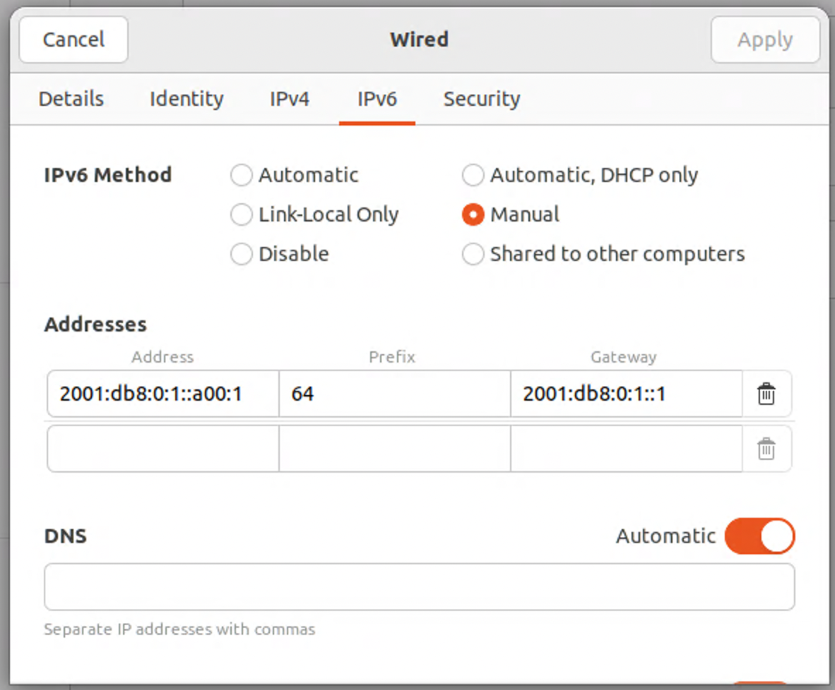 $ nmcli con mod ens0 ipv6.address 2001:db8:0:1::a00:1/64 ipv6.gateway 2001:db8:0:1::1