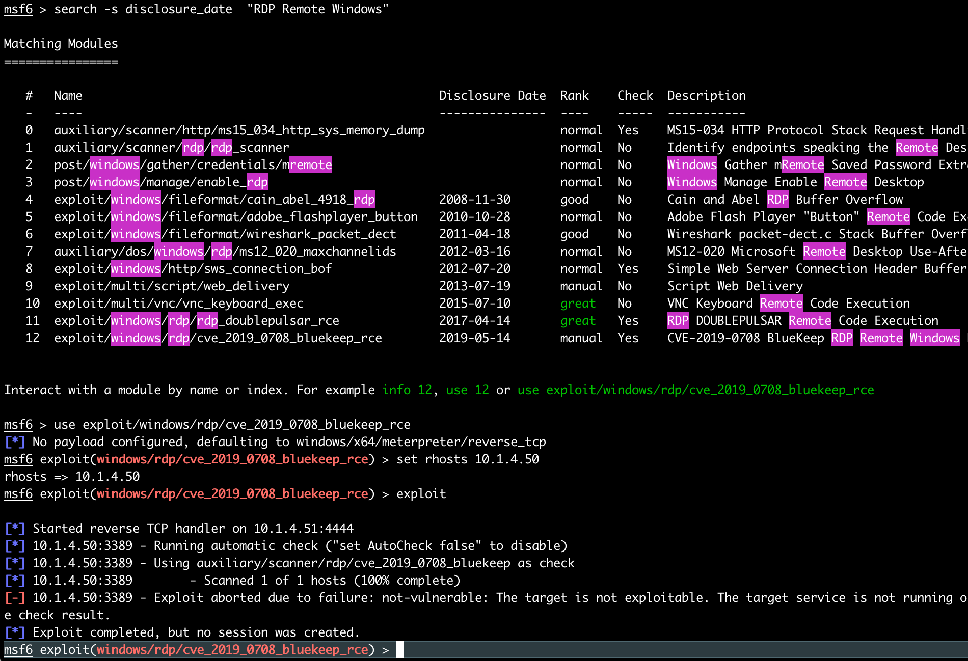 msf6 > search -s disclosure_date "RDP Remote Windows"