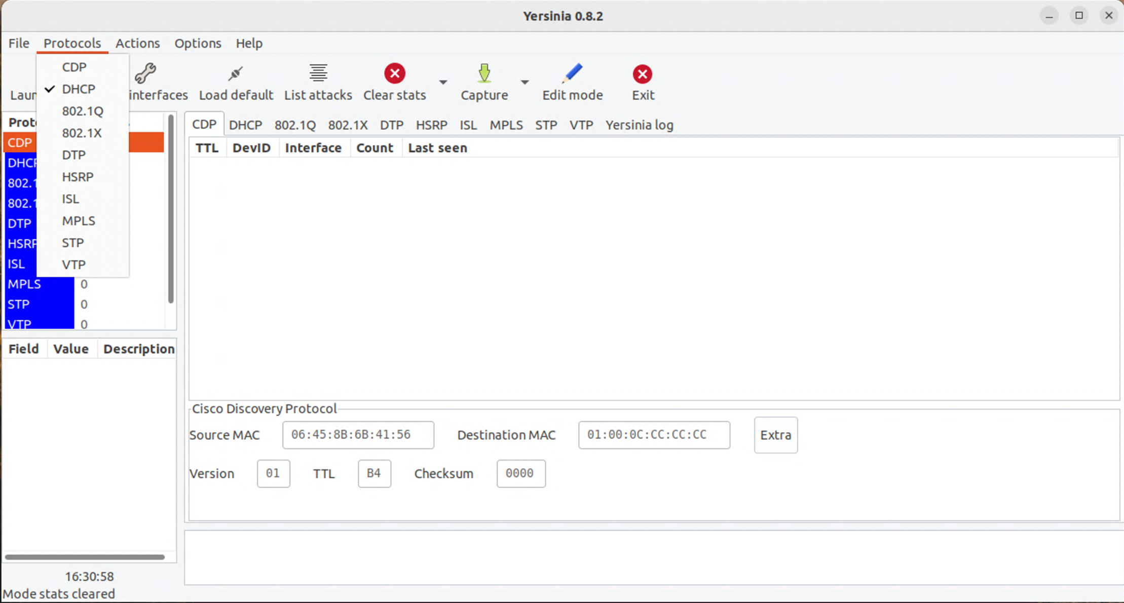 위 명령을 실행하면, 아래와 같이 Yersinia GUI를 볼 수 있다.